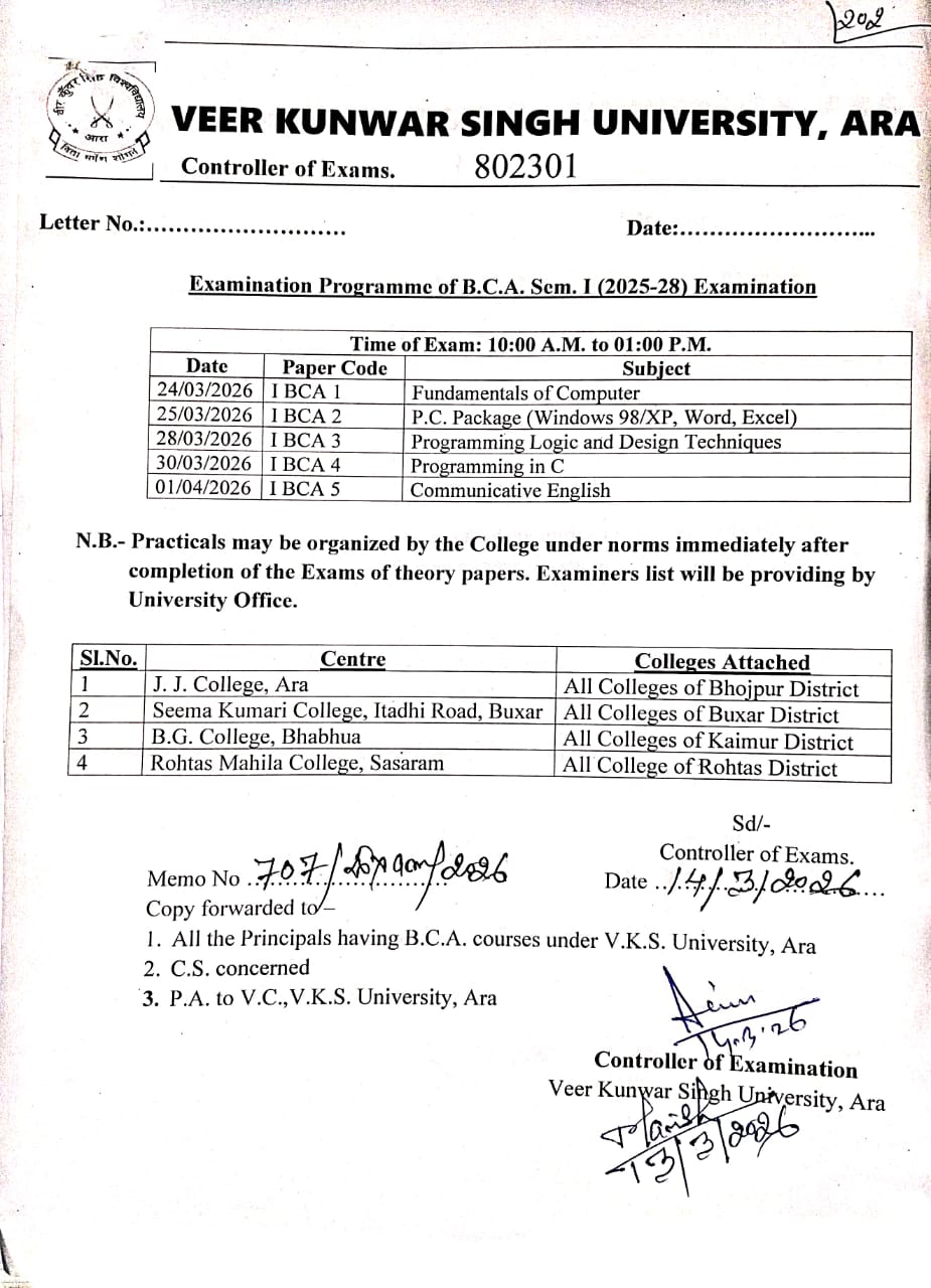 VKSU Ara BCA Sem-1 (2025-28) Examination Programme & Centre List |