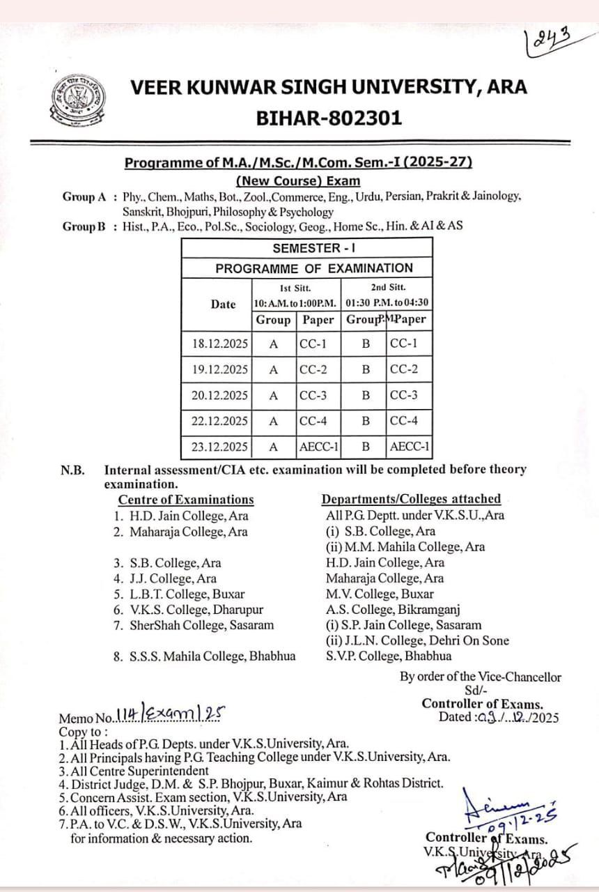 VKSU Ara PG Semester-1 Result 2025-27 Download | MA MSc MCom Result
