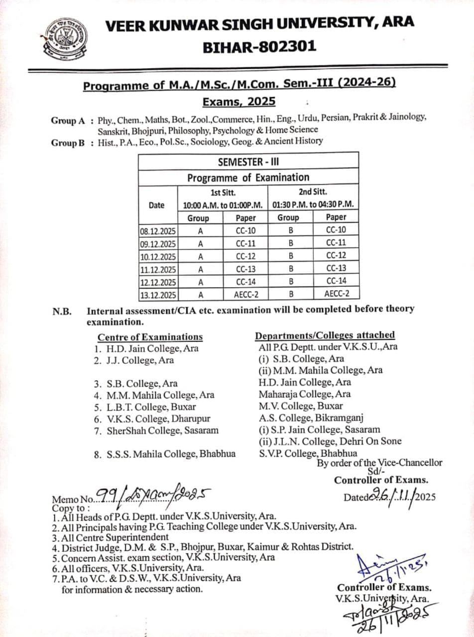 VKSU ARA स्नातकोत्तर PG सेमेस्टर-3 सत्र (2024-26) M.A, M.COM, M.SC का आज दिनांक 08-12-2025 से शुरू हो रहा है सिर्फ 10-12-2025 को होने वाली परीक्षा, सिपाही भर्ती परीक्षा के कारण स्थगित कर दिया गया है, अब यह परीक्षा दिनांक 15-12-2025 को पुर्व निर्धारित परीक्षा केंद्र पर ली जाएगी। तथा अन्य परीक्षा पुर्व निर्धारित समय अनुसार आयोजित किया जाएगा।