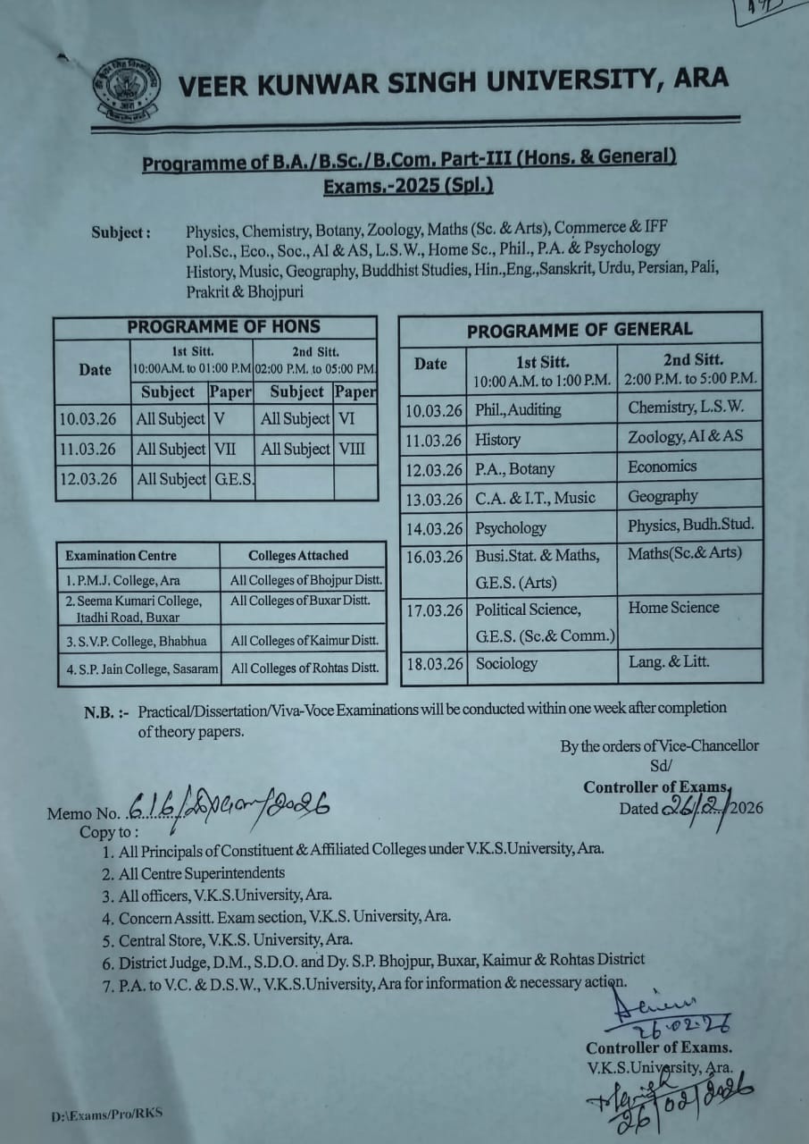Short Information: वीर कुंवर सिंह विश्वविद्यालय, आरा (VKSU, Ara) ने स्नातक (B.A, B.COM, B.SC) ओल्ड कोर्स पार्ट-3 के उन छात्र-छात्राओं के लिए स्पेशल परीक्षा का Admit Card जारी कर दी है, जो छात्र-छात्रा सत्र 2020-23, 2021-24 और 2022-25 में प्रमोटेड या फेल रह गए थे। और स्पेशल परीक्षा फॉर्म भरे है वे अब अपना Admit Card डाउनलोड कर दिनांक 10-03-2026 से 18-03-2026 तक होने वाली स्पेशल परीक्षा में सामिल हो सकते है|