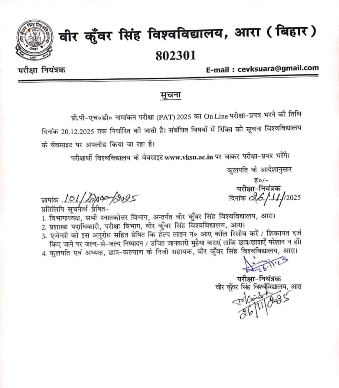 Veer Kunwar Singh University (VKSU), Ara is inviting online applications for the Pre Ph.D Admission Test (PAT) 2025. This entrance test is conducted for admission into Pre Ph.D courses for academic sessions 2025–28. Interested and eligible candidates can apply online through the official website of the university: https://vksu.ac.in And https://vksuexams.comThe application process will begin from 27 November 2025. Candidates are advised to read the complete information brochure or official notice available on the VKSU website before applying.